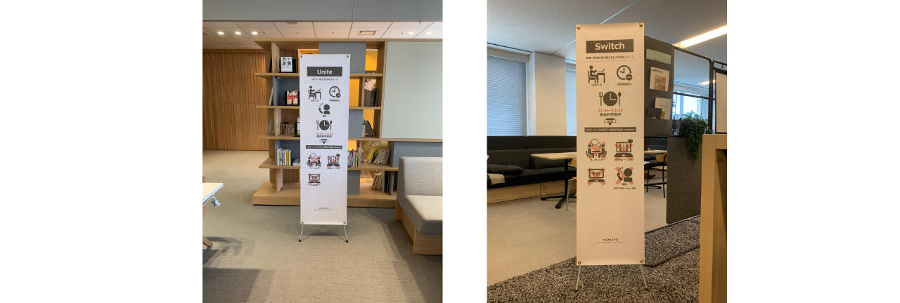 時間ごとに運用ルールが変わるため、ランチタイム中でもソロワークで利用している社員がいるなど、ルールを定着させるのが特に難しいエリアでした。その対策として、運用ルールを明示した、高さ160cm横45cmの立て看板を設置しました。