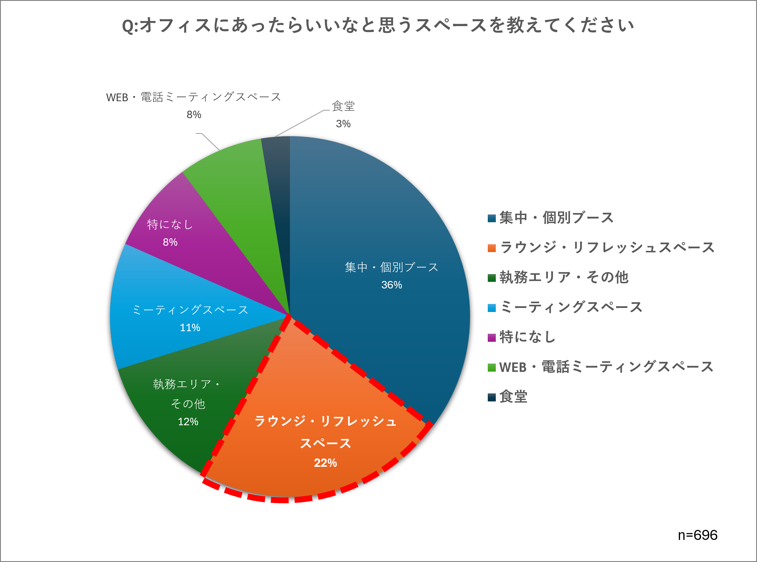 私たちが実施したアンケートで「オフィスにあったらいいなと思うスペースを教えてください」とお伺いしたところ、集中・個室ブースに続く2位として、回答者の約2割のお客様が、カジュアルな打合せやリラックスした雰囲気で働くことのできる「ラウンジ・リフレッシュスペース」の設置を望まれていることが分かりました。