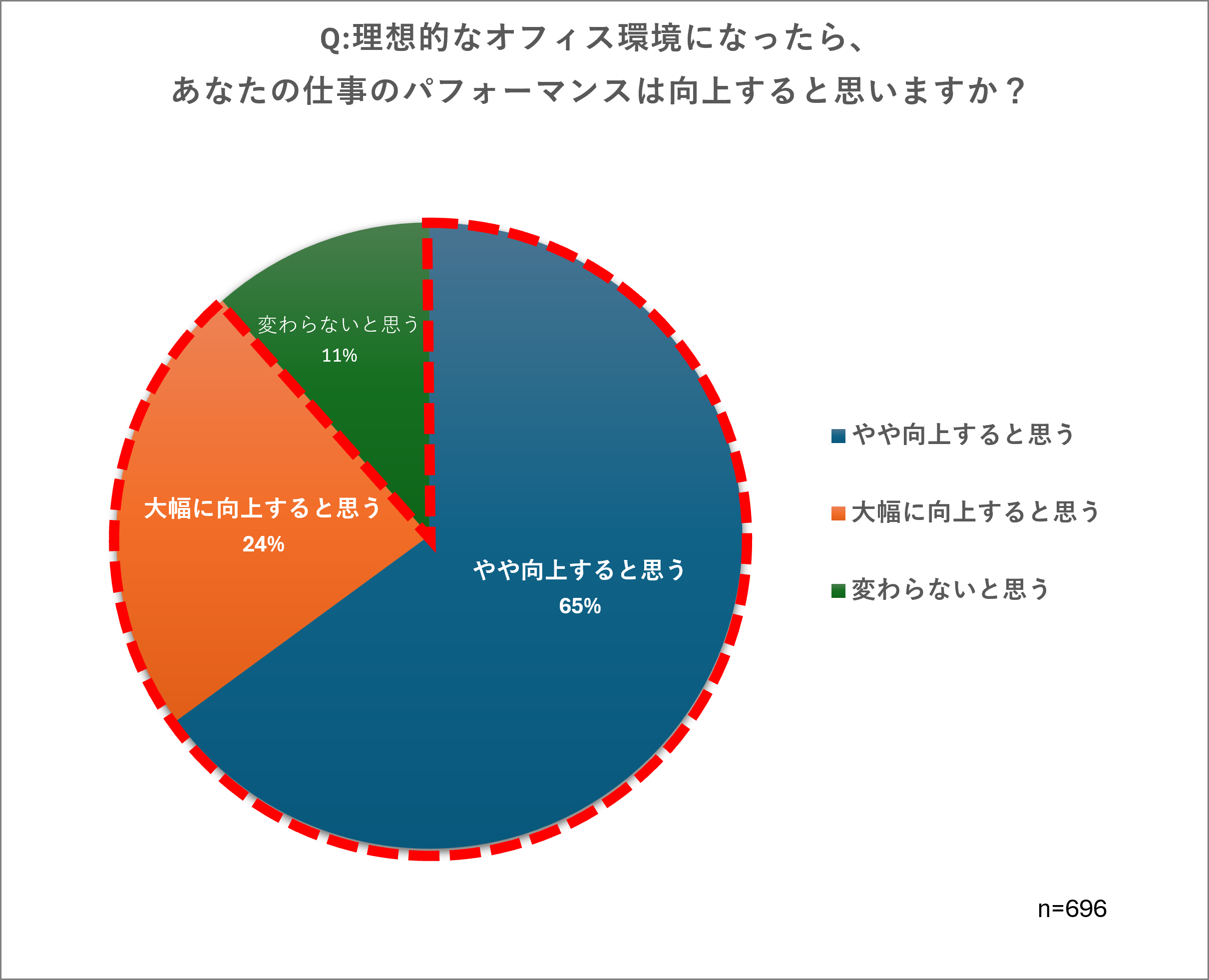 また、理想的なオフィス環境によってパフォーマンスが向上するかどうかには、約9割のお客様が「向上すると思う」と回答されています。1日の約半分を過ごすオフィスだからこそ、心地よく働ける環境を望まれていると共に、多様な働き方に対応できる空間を求めている方が多いようです。