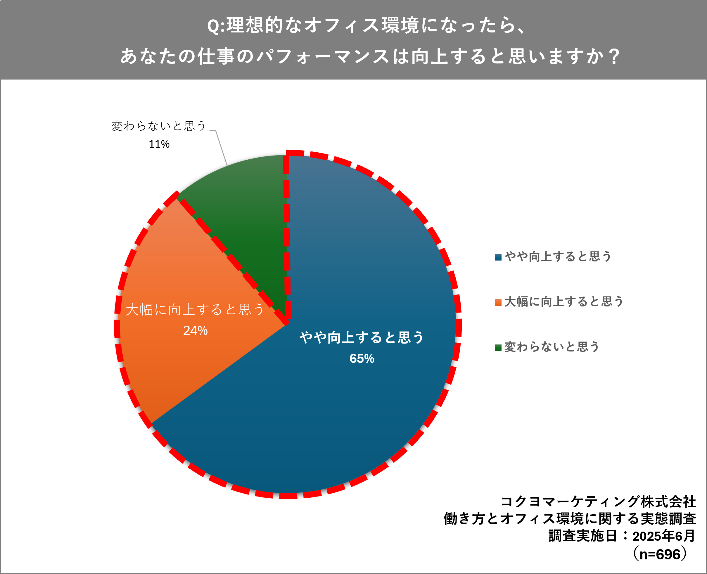また、理想的なオフィス環境によってパフォーマンスが向上するかどうかには、約9割のお客様が「向上すると思う」と回答されています。1日の約半分を過ごすオフィスだからこそ、心地よく働ける環境を望まれていると共に、多様な働き方に対応できる空間を求めている方が多いようです。