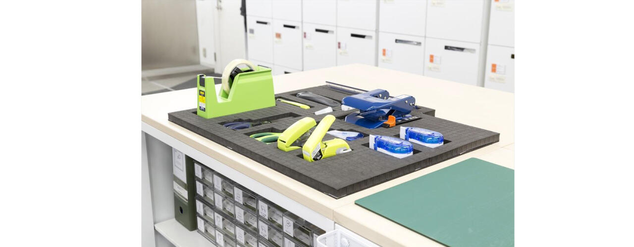 このコーナーには、テープカッターや穴あけパンチ、はさみなどが「型抜きシート」に配置され、「使ったら元の場所に戻す」運用で自然と整理整頓できる仕掛けにしています。