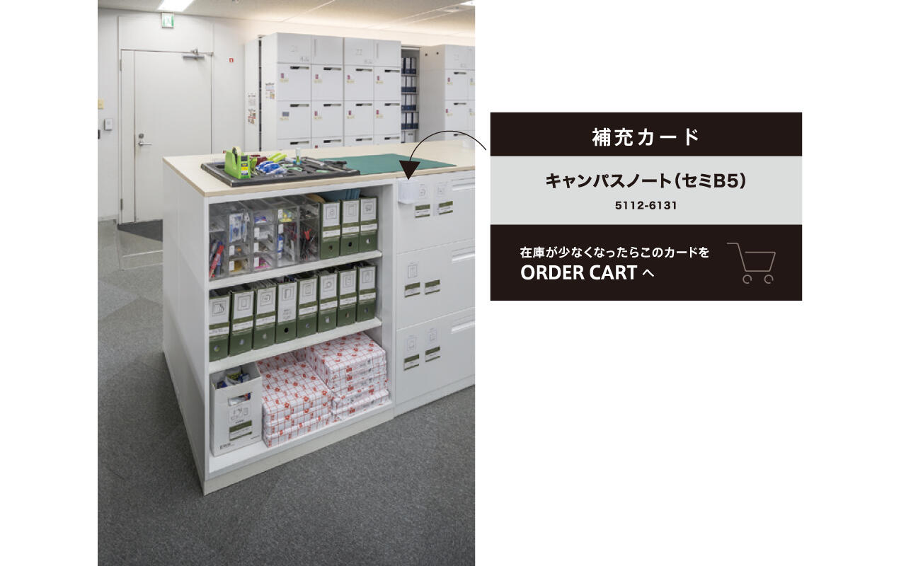 サプライドックには、補充カードをそれぞれのボックスに入れておき、残数が発注点を下回ったら補充カードを注文用のカゴに入れておくなどの、手間を掛けずに在庫状況が把握できる仕組みとしています。