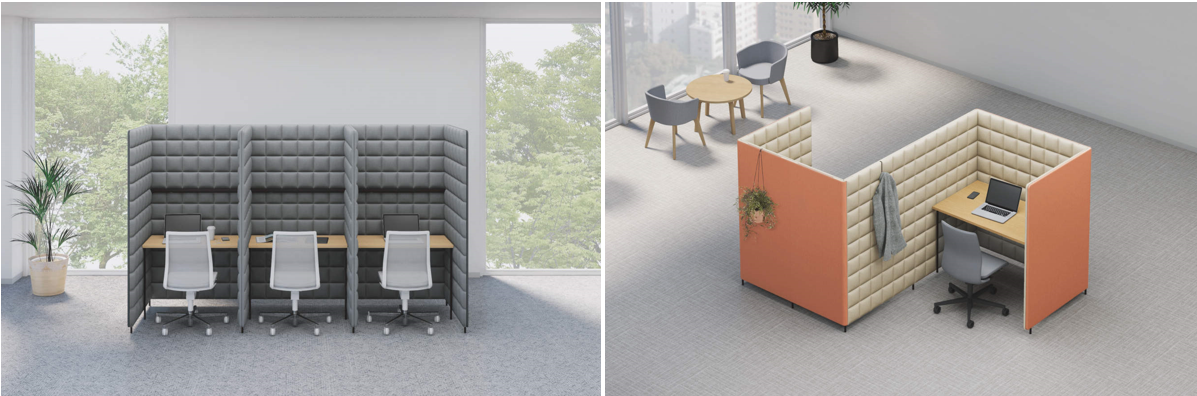コンパクトで幅広いレイアウトに対応できる半個室ブースです。バックパネルが付いているタイプは、画面越しの相手も背景が気にならず、覗き見防止にもなります。天板の高さは2種類で、H720mmタイプ(写真左)は集中して行うソロワークやウェビナーの視聴に、H1000mmタイプ(写真右)はハイスツールや立ち姿勢でのライトワークにも活用できます。