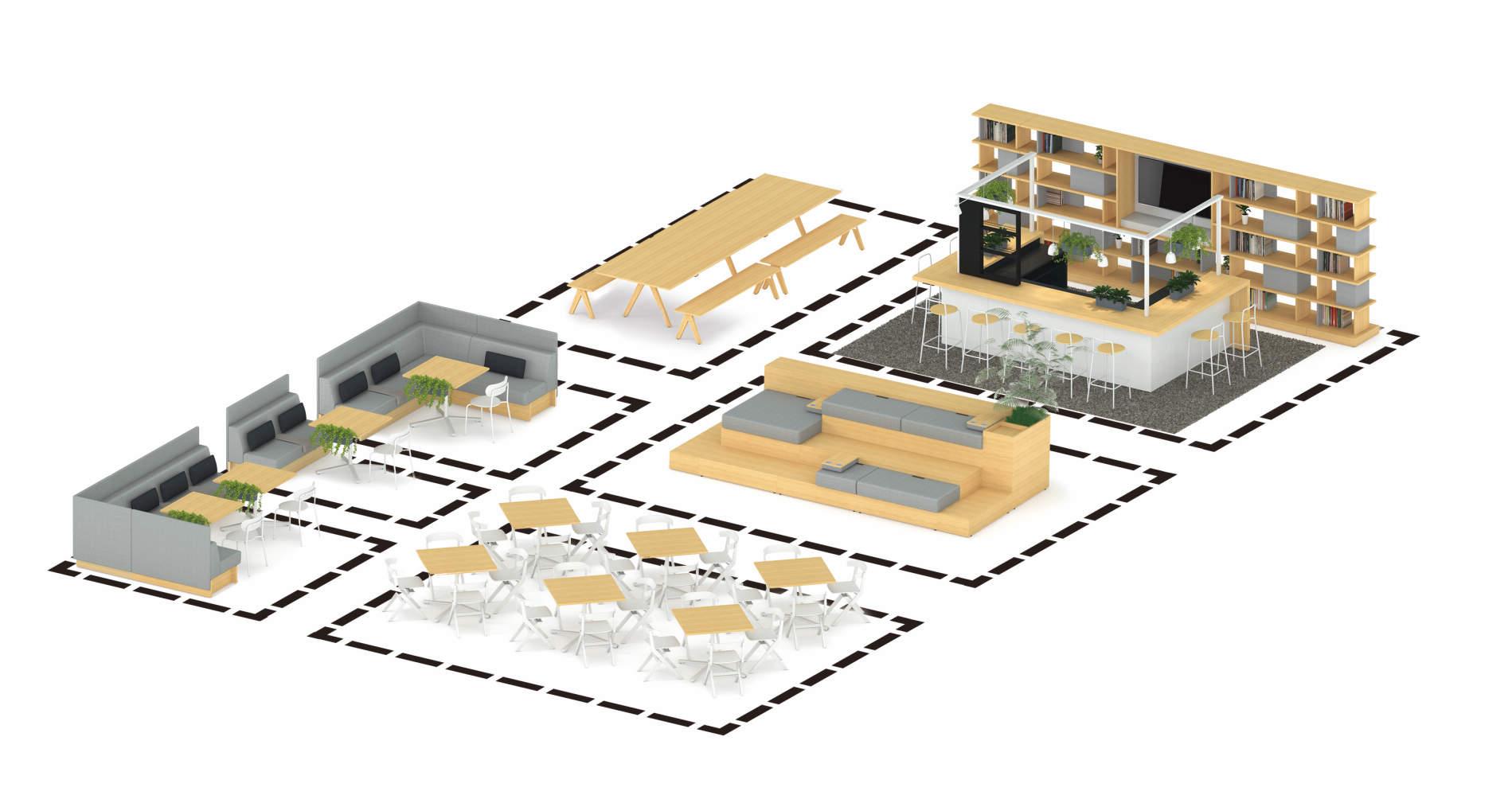 テーブルを縦横交差して配置するレイアウトです。ジグザグ通路のため導線が固定化するのを防ぎ、人と接する機会が自然と増える仕掛けになっています。一方で集中しにくい環境となっています。