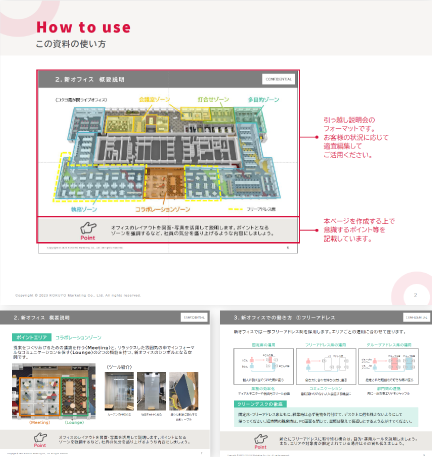 いつまでに誰が何の作業をしなくてはいけないのか、引っ越しの概要説明のほか、新しいオフィスでの働き方など、説明ポイントをフォーマットとして整理いたしました。