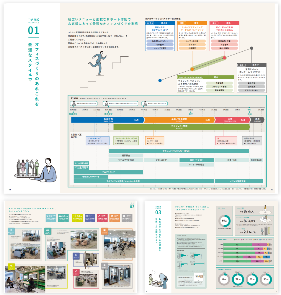 現状の課題抽出からコンセプト策定、設計・デザイン、施工、そして運用までサポートするコクヨのソリューションメニューをご紹介しています。