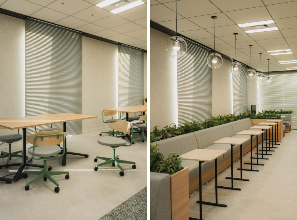 オフィスの中心のチームワークエリアではお弁当を取る人が増えてきて、部署や性別関係なく和気あいあいと会話をしている光景を目にします。業務で必要な会話と業務から離れた会話の両方が発生することで、同じ社員同士“分かり合える”シーンが多くなっているように感じます。