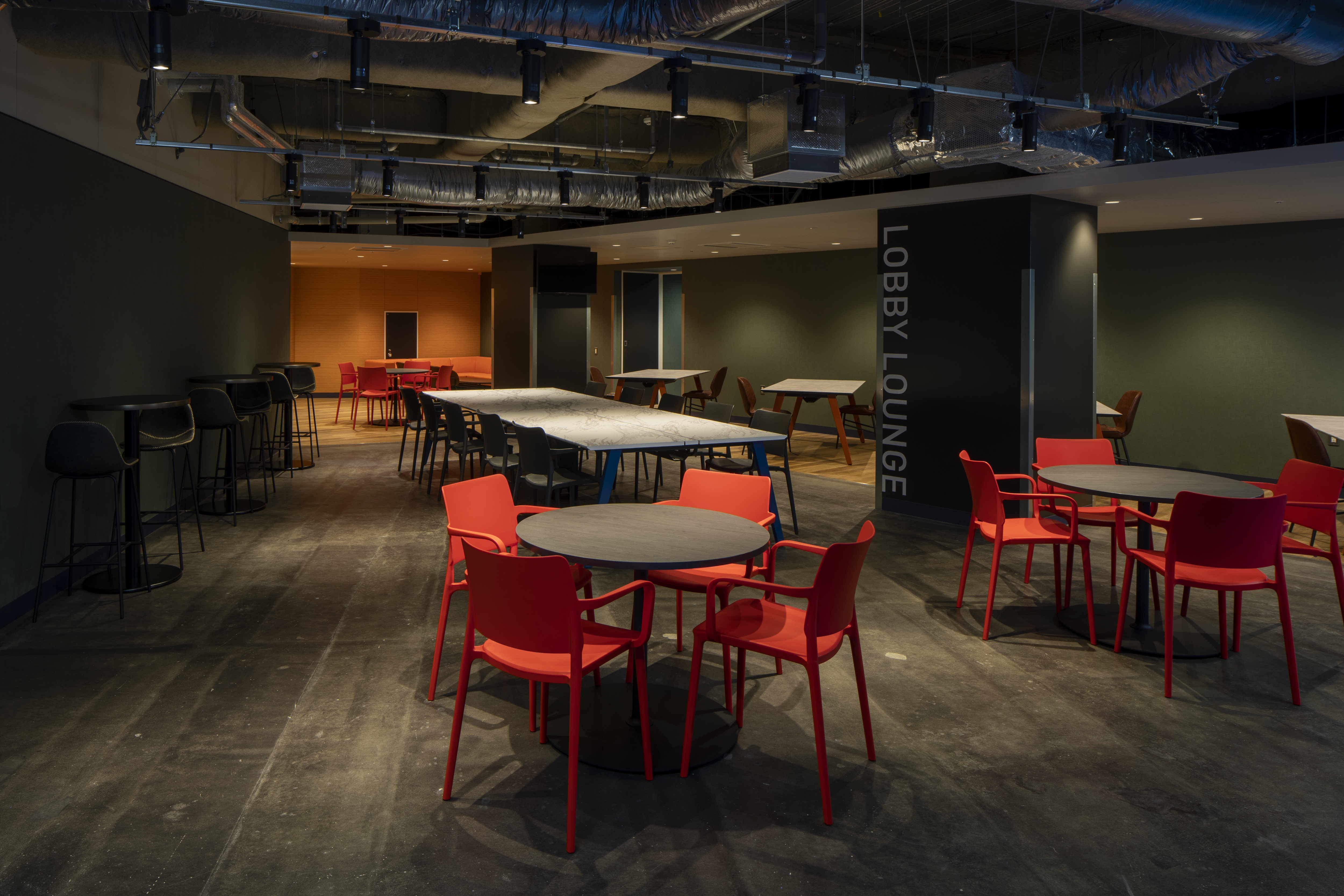 事務所エリア内にあるロビーラウンジ。Kアリーナで働く社員様用のラウンジエリアになっており、仕事や休憩にも使用できる多目的空間です。