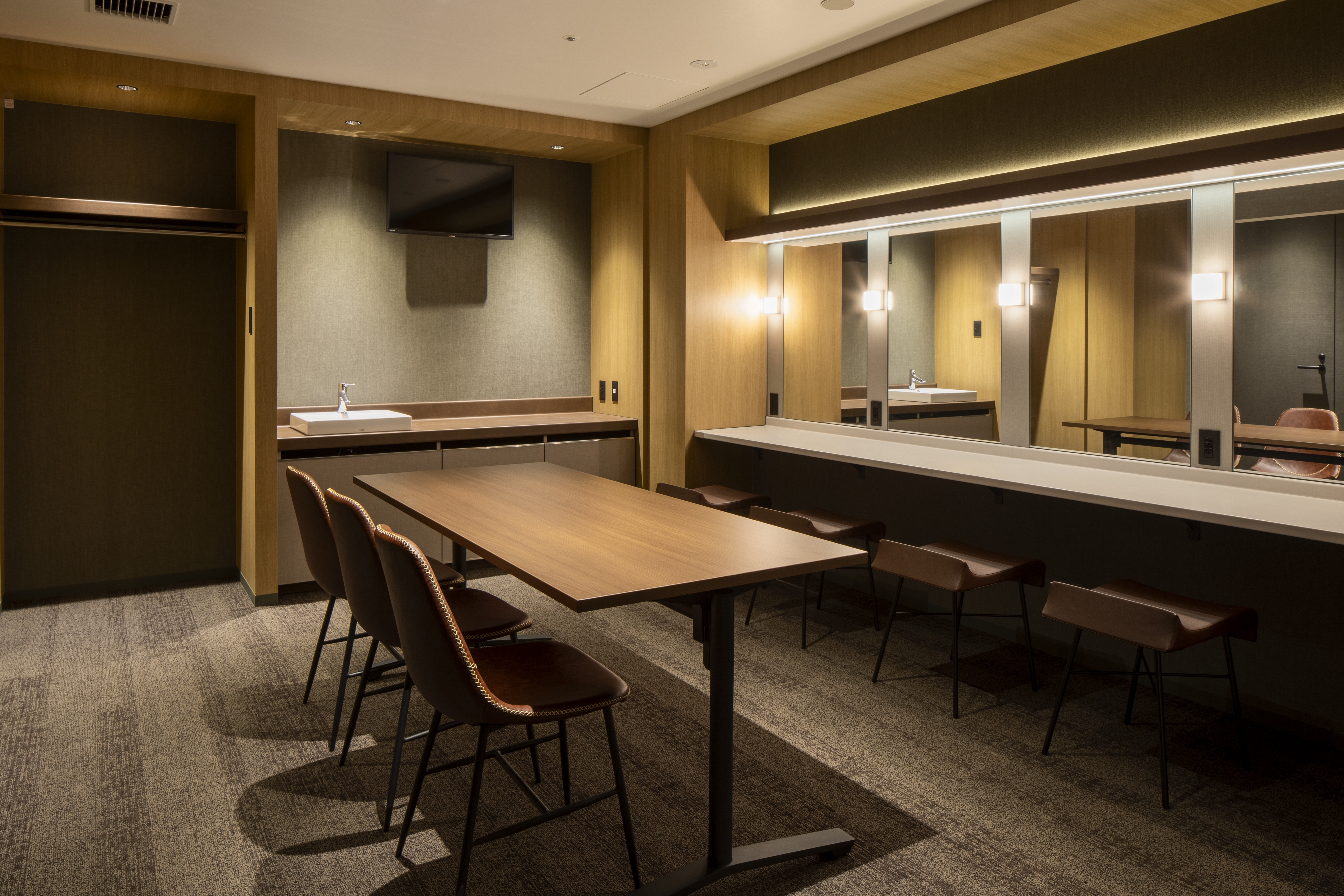 Kアリーナ内にある出演アーティスト用の控室。柄のある貼地や木調の家具を採用し、ラグジュアリーさを持たせつつ、落ち着くことができる空間に。