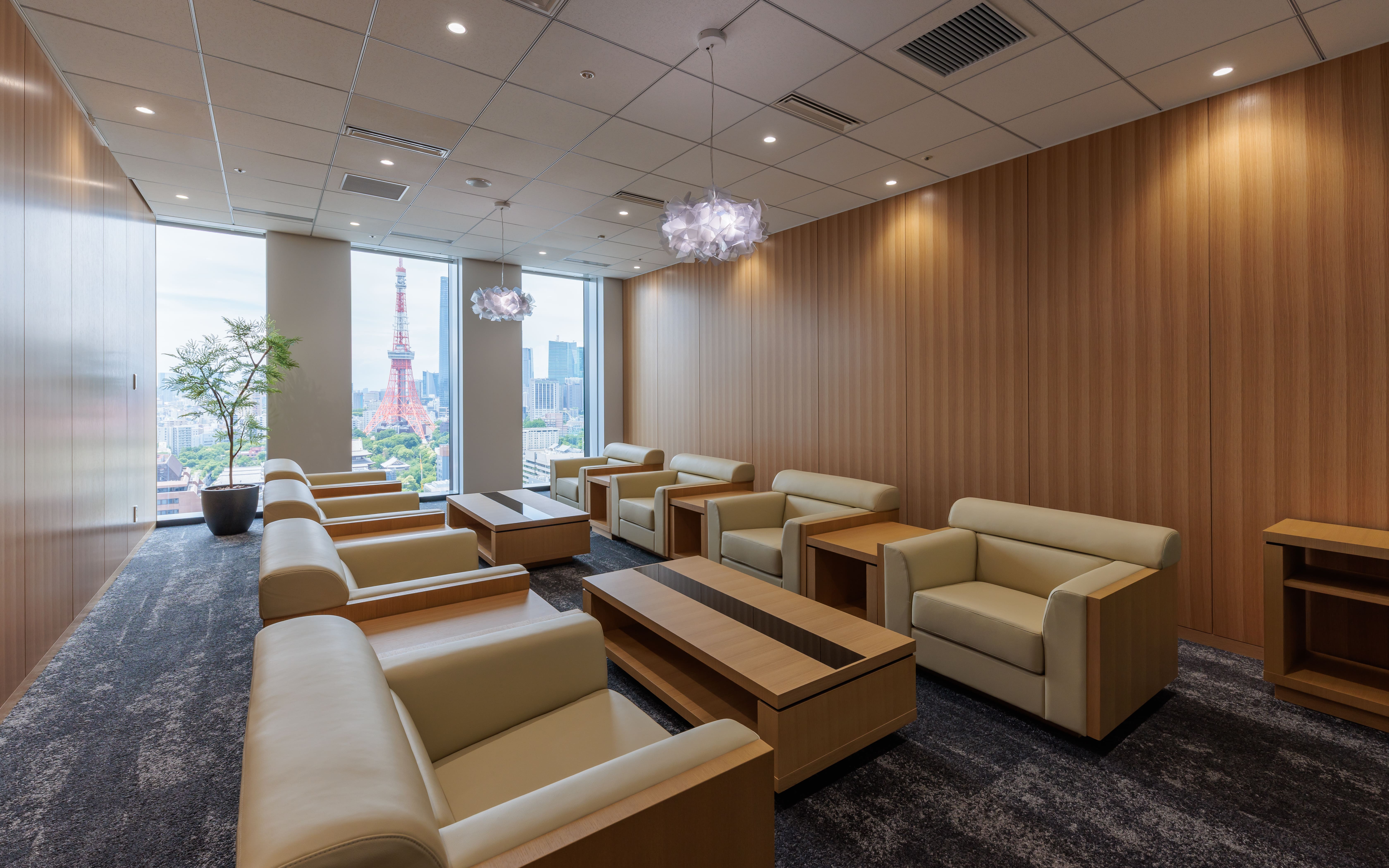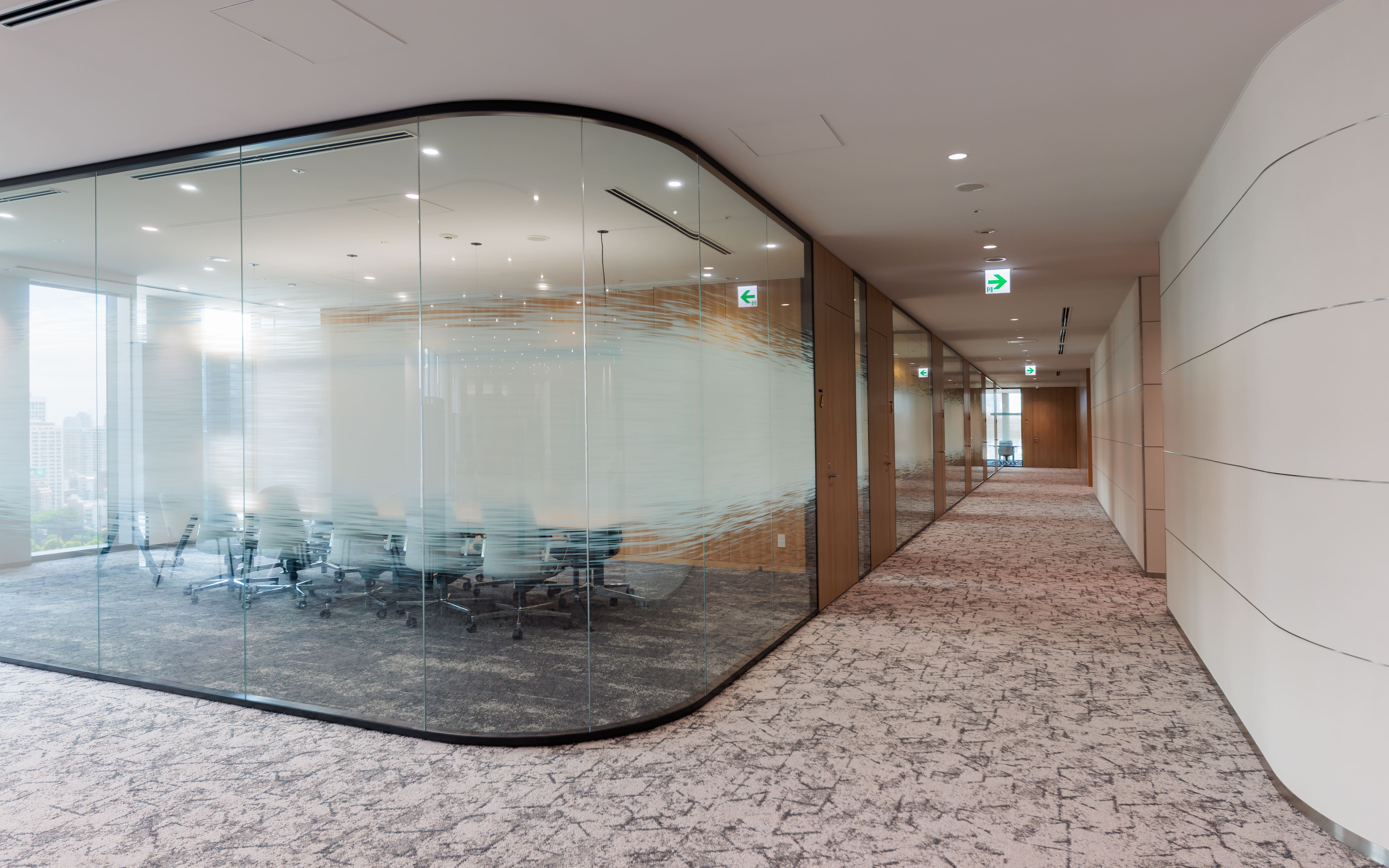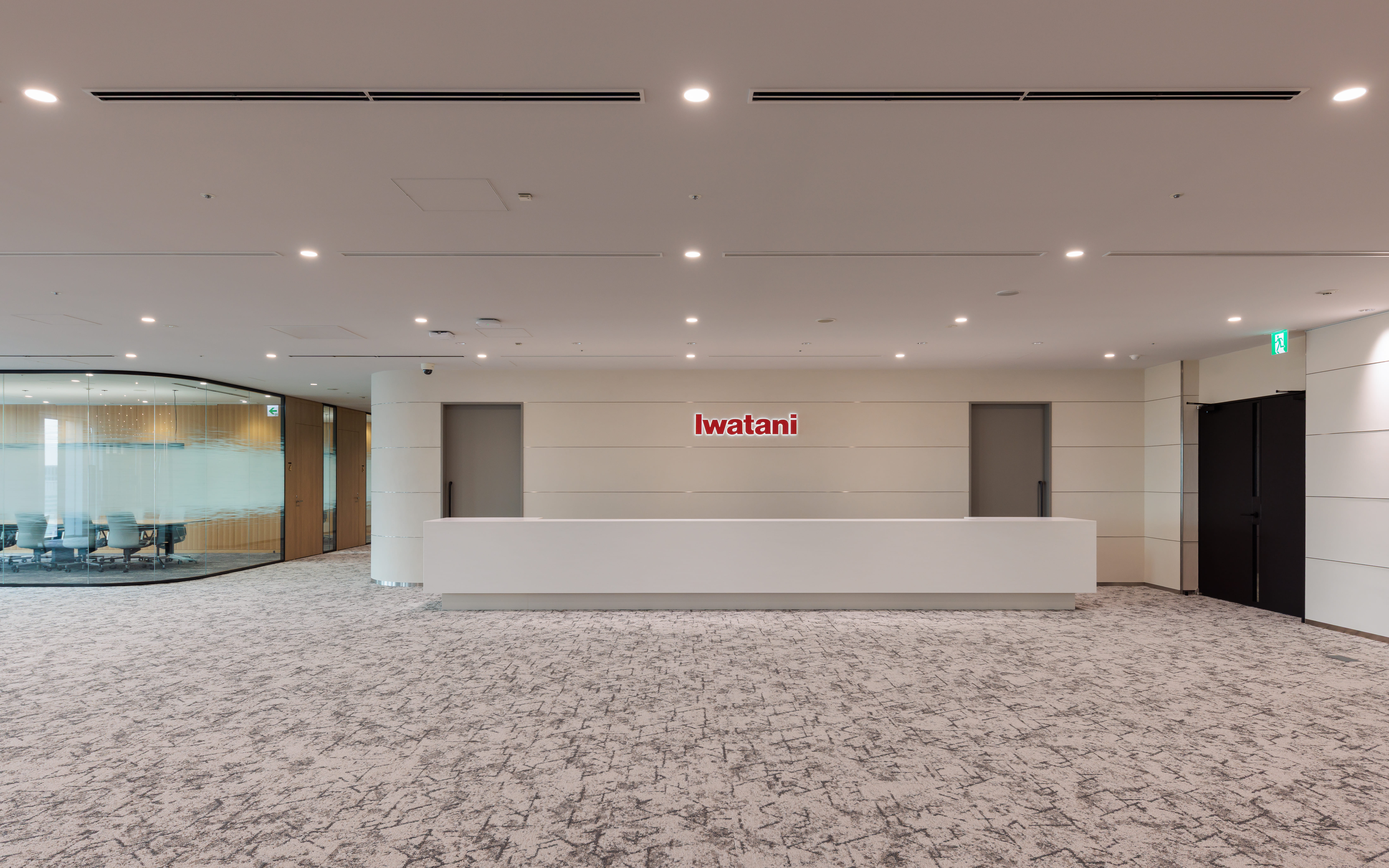 岩谷産業オリジナルのガラスフィルムを作成。Rで構成されたガラスパーティションと在来壁で、来客応接室エリアへ優しく誘います。