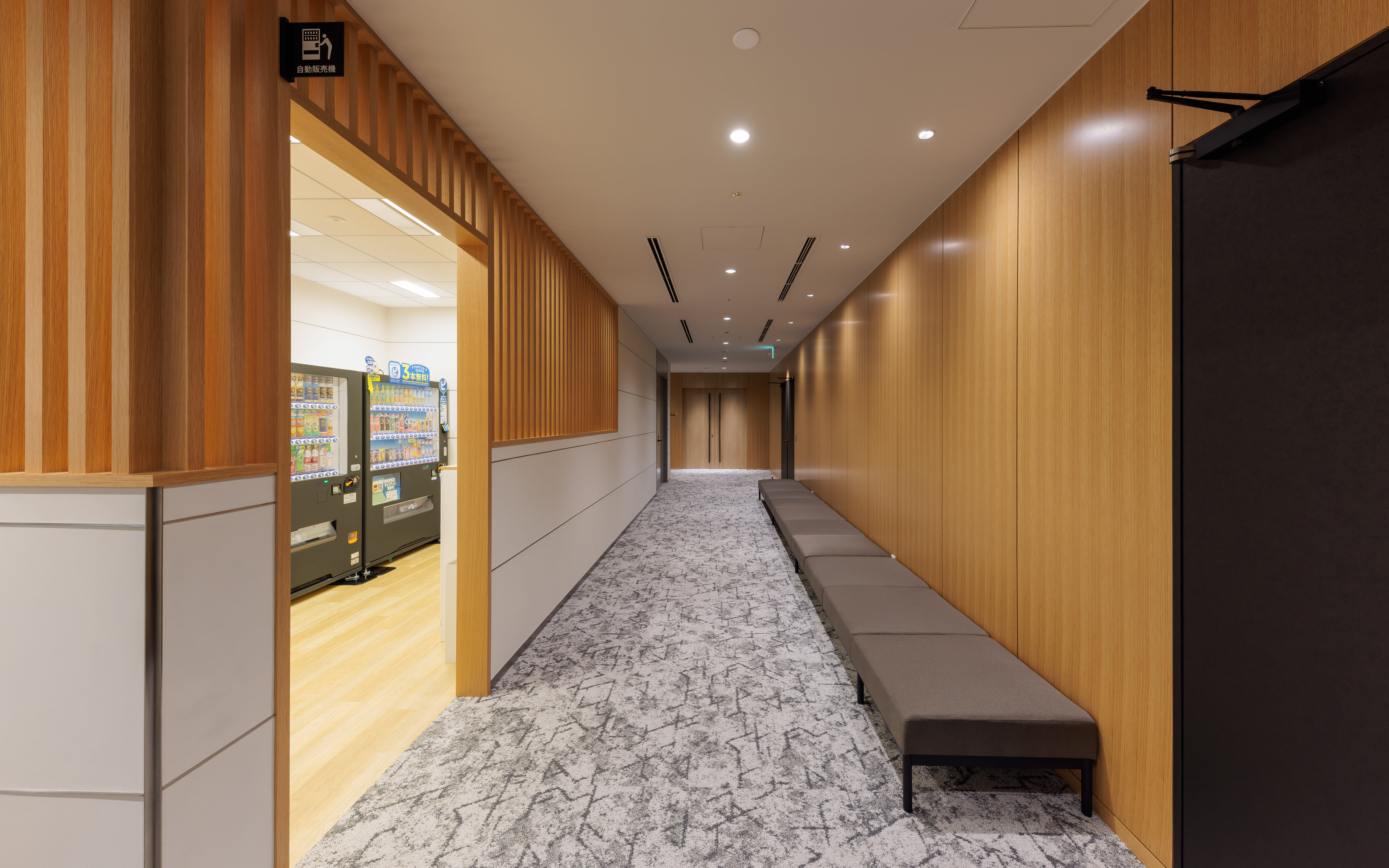 セミナールーム前のホワイエにはベンディングエリアを設置。明るく統一感のある空間としています。