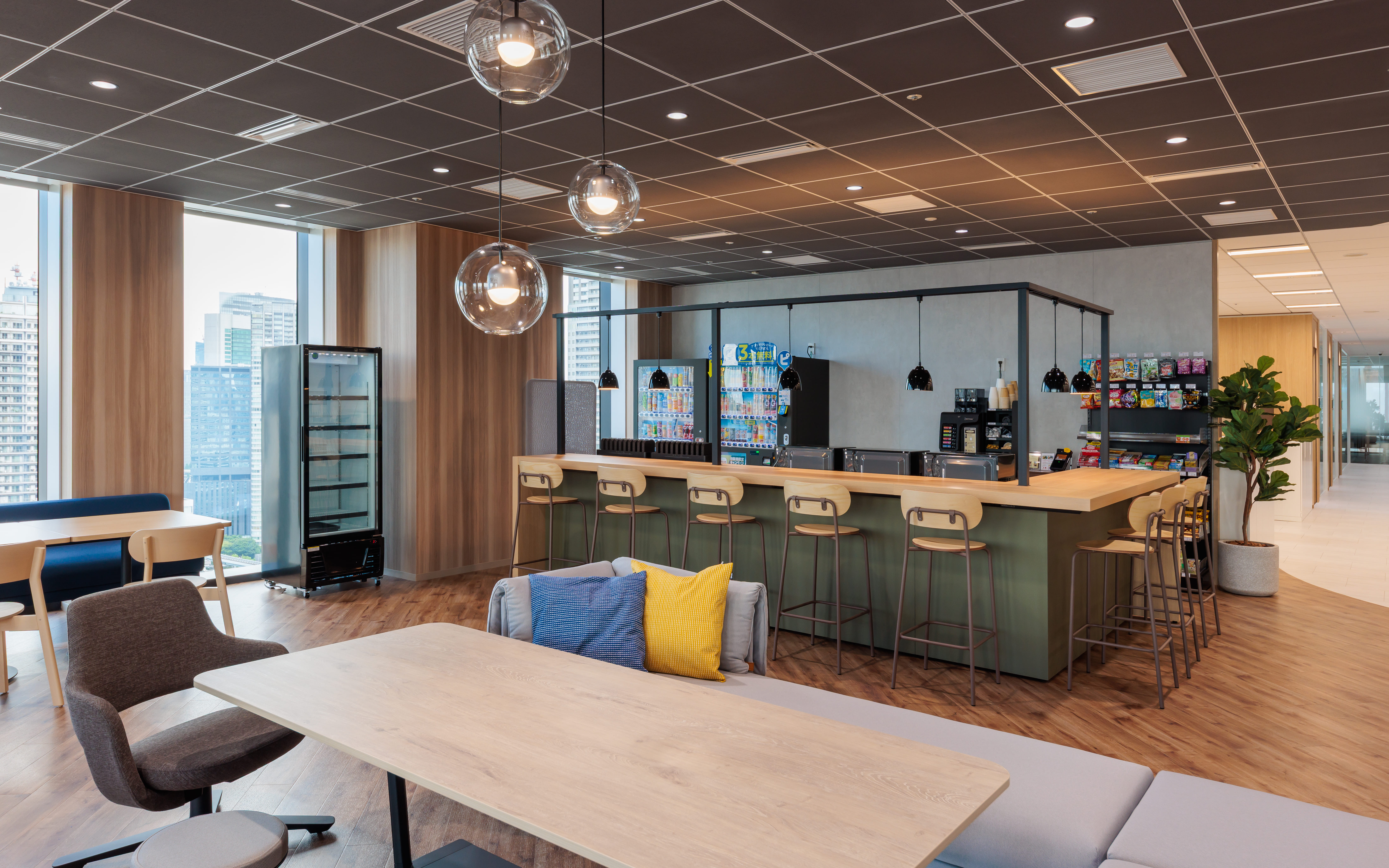 社員がリフレッシュや業務に利用できるカフェ空間は、社員のON/OFFを促し、モチベーションを向上させます。