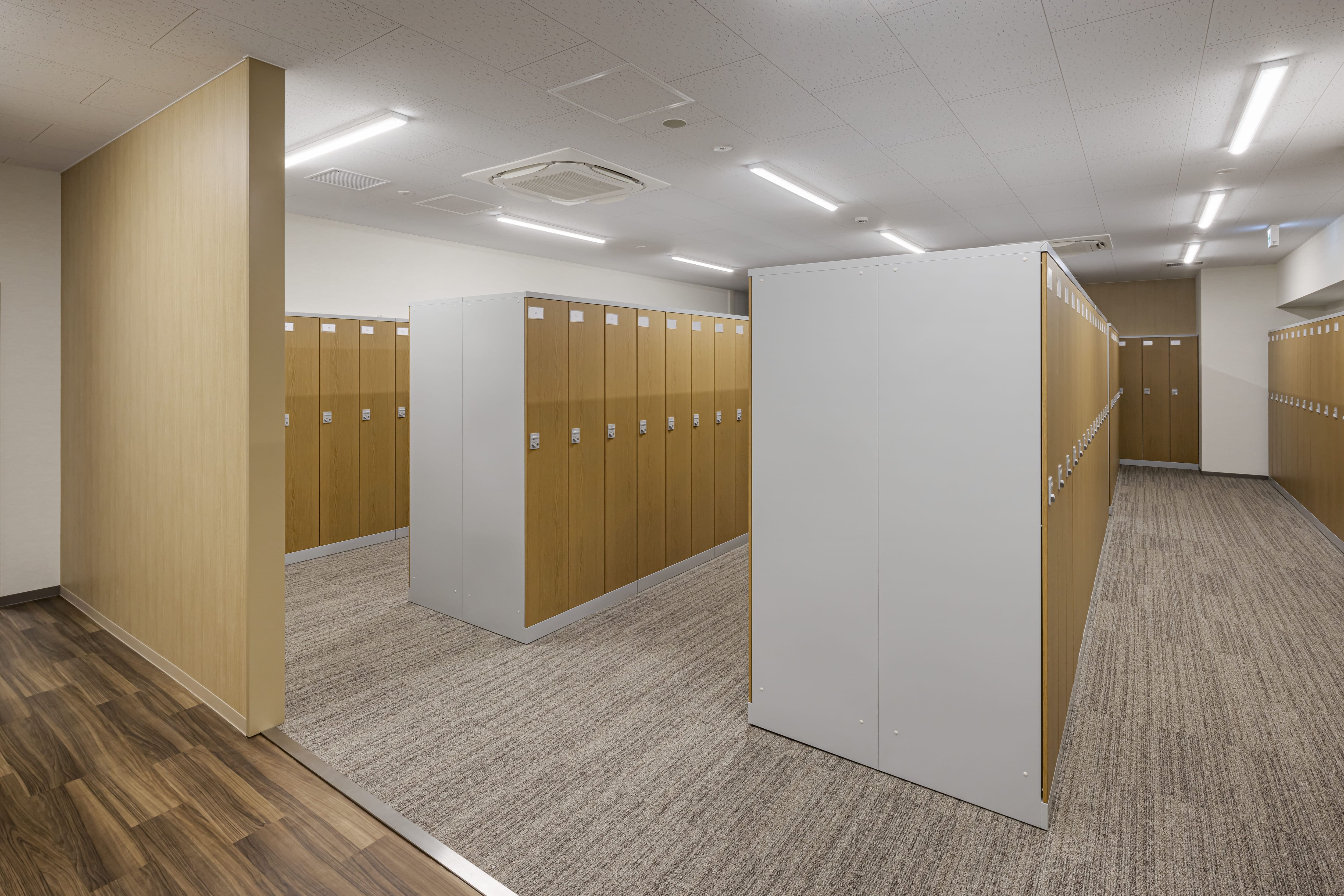 明るいカラーで更衣室にリフレッシュスペースとしての雰囲気・機能をプラスしています。