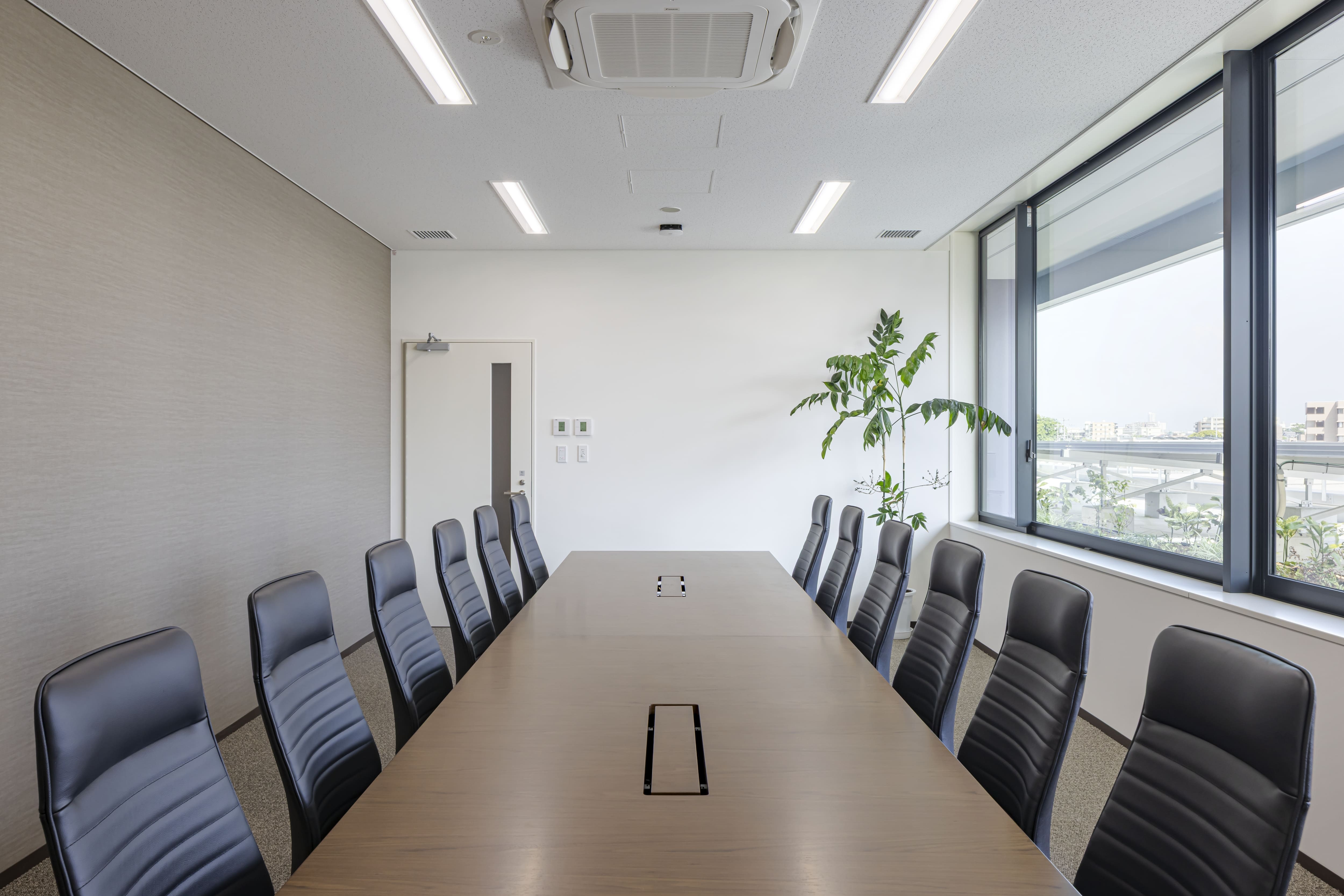 ダークブラウンの会議テーブルとレザーチェアで機能的ながら重厚感のある空間を演出。