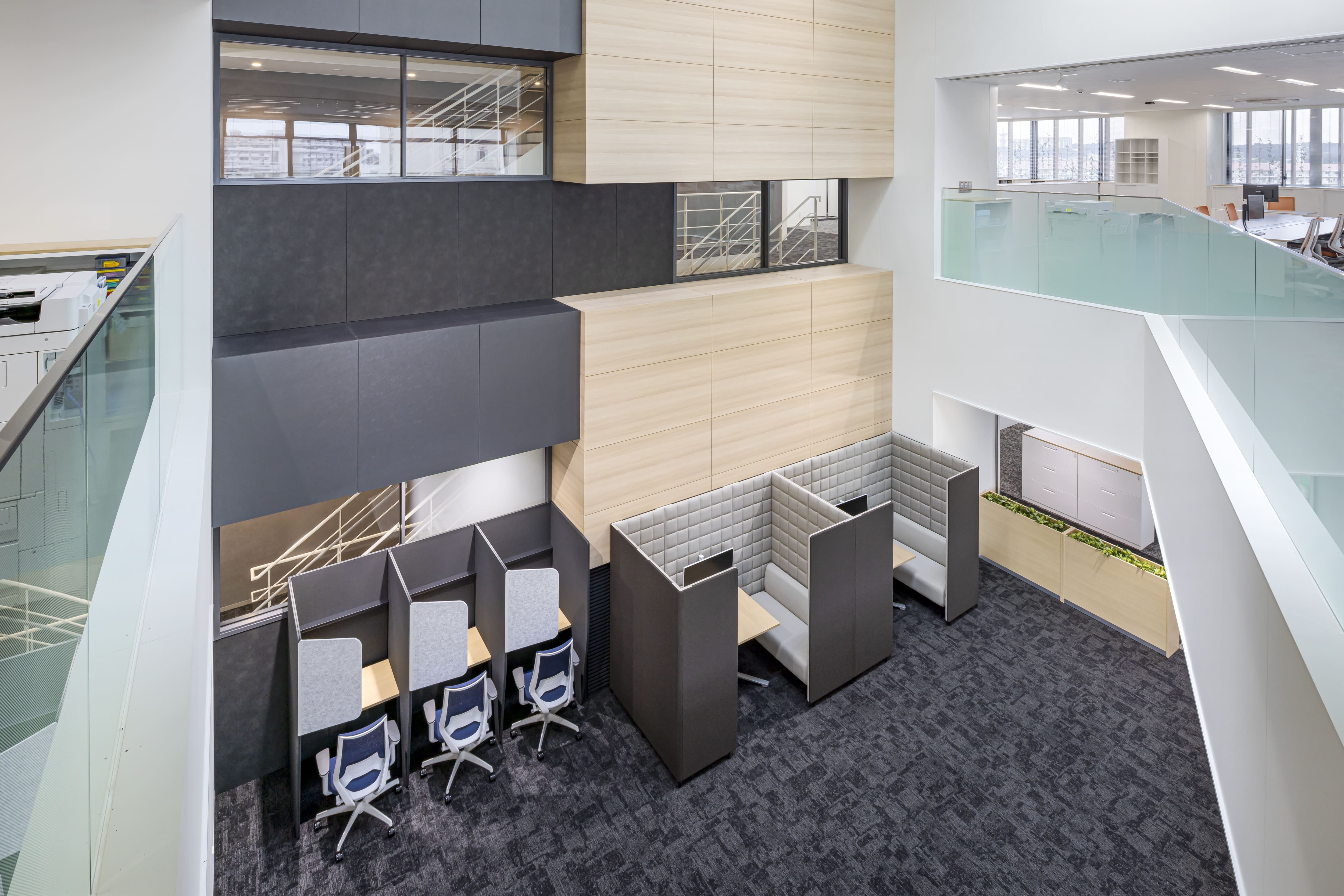 中央の吹き抜けスペースにブース席を設置し、開放感と集中力を両立。各フロアとの視覚的連携を保ちながらプライバシーも確保。